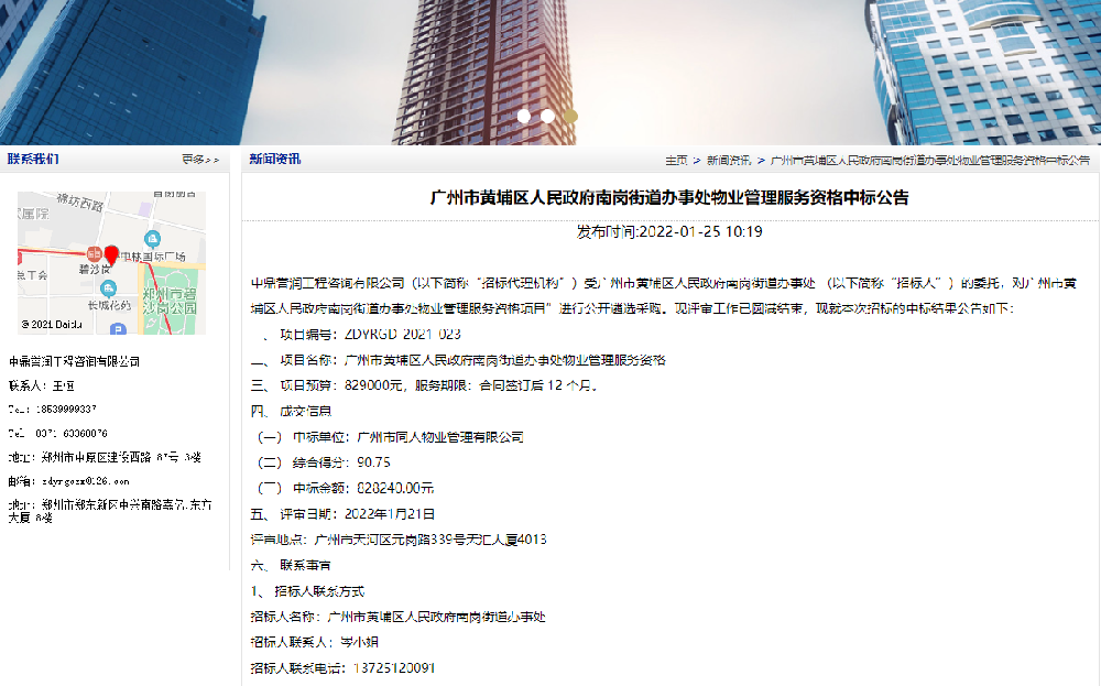 鼎點娛樂工程咨詢有限公司(以下簡稱“招標代理機構”)受廣州市黃埔區人民政府南崗街道辦事處 (以下簡稱“招標人”)的委托,對廣州市黃埔區人民政府南崗街道辦事處物業管理服務資格項目”進行公開遴選采購,F評審工作已圓滿結束,現就本次招標的中標結果公告如下:一、項目編號:ZDYRGD-2021-023二、項目名[詳細]